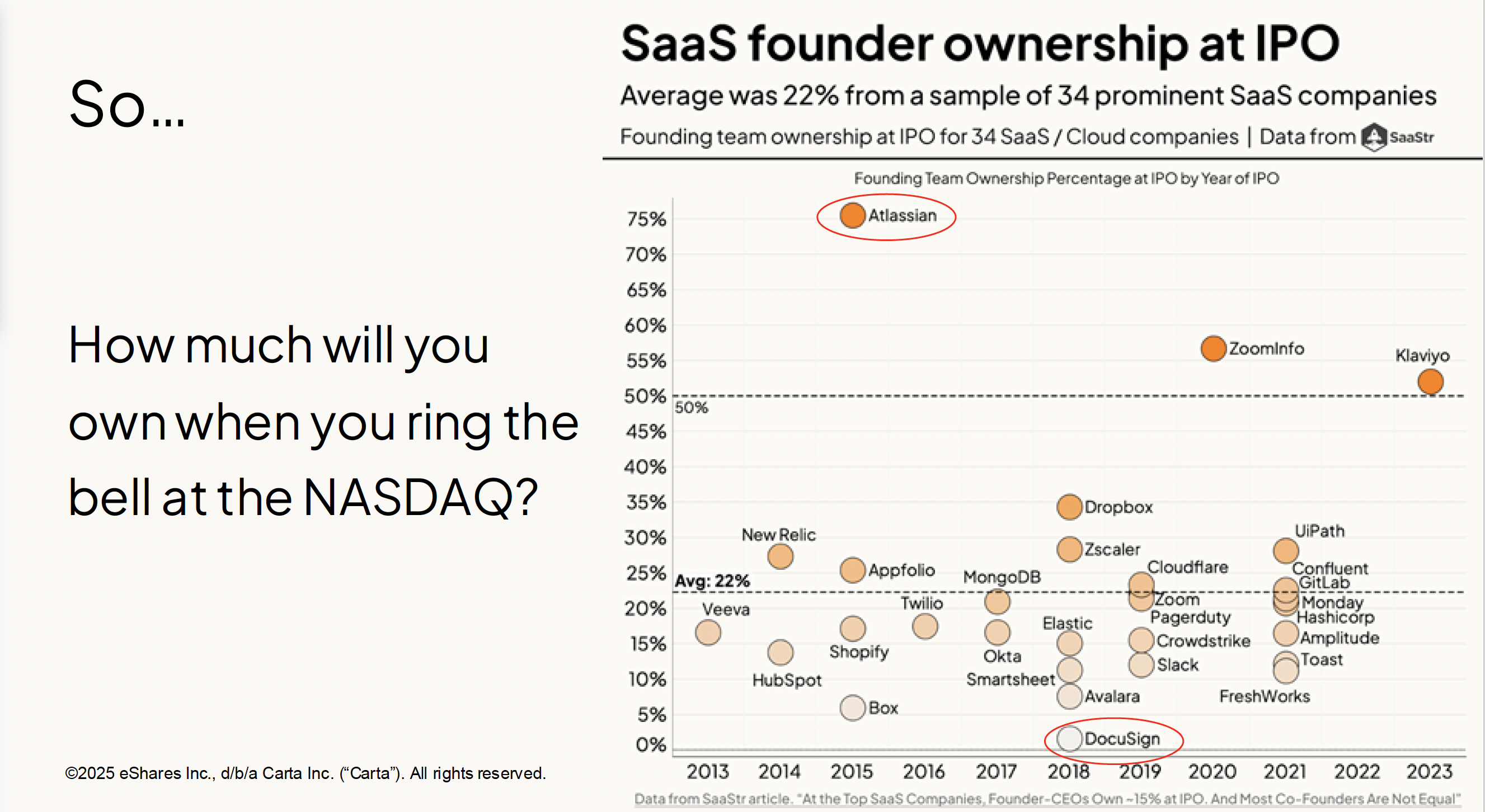 The data shows a wide range of outcomes. A recent analysis of prominent SaaS companies found the average founder ownership at IPO was 22%.